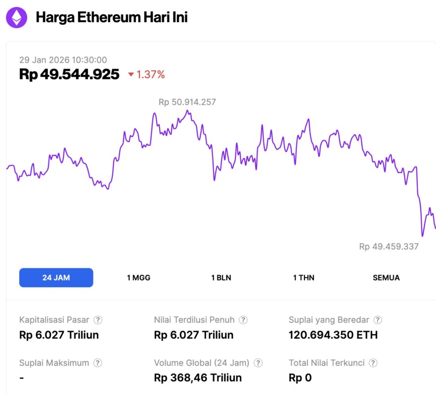 On January 29, 2026, Ethereum was trading at approximately $2,945, or around IDR 49,544,925 — marking a 1.37% decline over the past 24 hours. During that period, ETH dipped to a low of IDR 49,459,337 and reached a high of IDR 50,914,257.