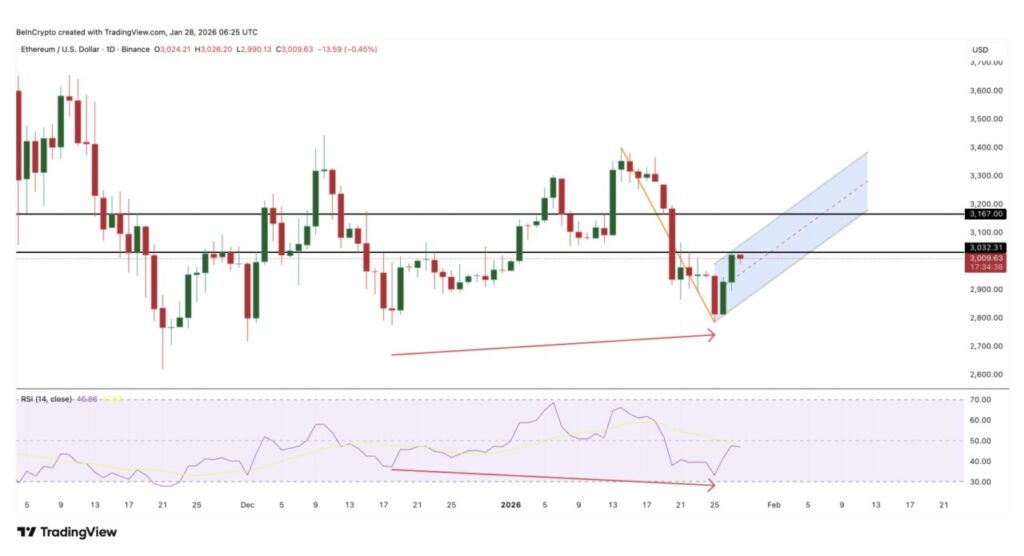 Technically, Ethereum recently showed a hidden bullish divergence between December 18 and January 25. During this period, the price formed a higher low, while the RSI (Relative Strength Index) printed a lower low.