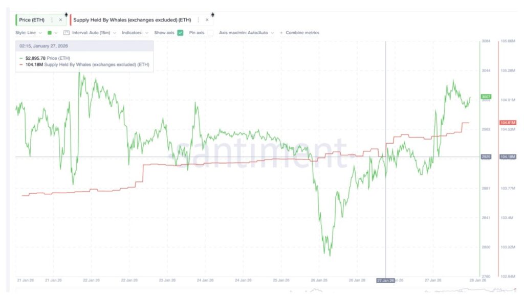 Along with that stabilization and the hope of the bearish trend being reversed, the big holders started to move. Ethereum whales increased their holdings from 104.18 million ETH to 104.61 million ETH after the ERC-8004 announcement. That translates to an addition of about 430,000 ETH, or the equivalent of approximately $1.3 billion at the average price-signaling massive accumulation.