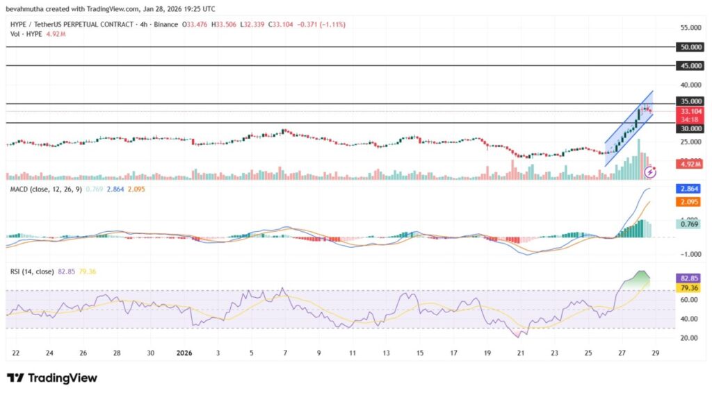 Technical analysis shows that HYPE’s main support is around $30.00, which is an important psychological point for the price. Local resistance is at levels around $35.00, which if broken could open up more upside space. In this context, a breakout above $35-40 could strengthen the bullish bias for the short term.