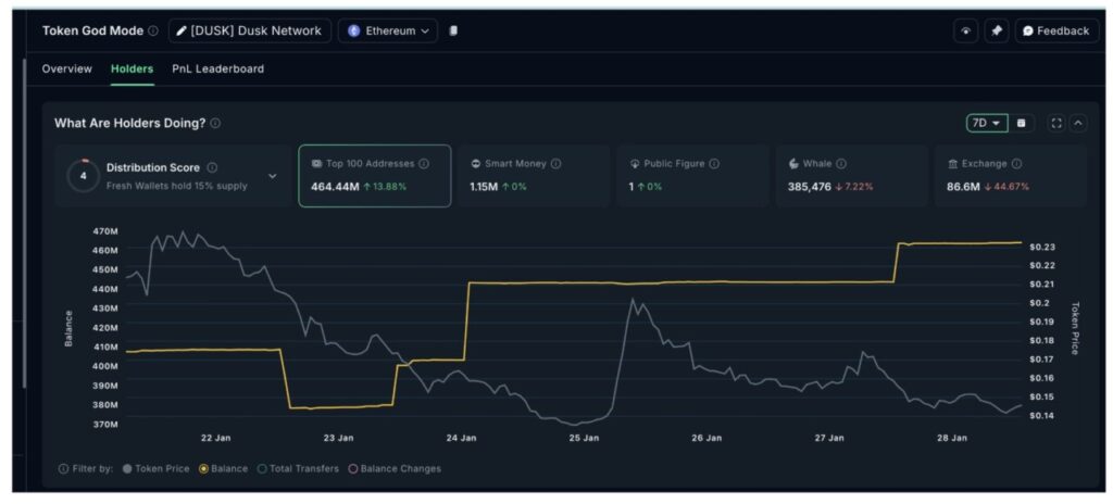 Standard whale wallets reduced their holdings by 7.22% during the correction. In contrast, the top 100 addresses increased the amount of DUSK they held by 13.88%, to a total of 464.44 million DUSK. This means that around 56.6 million DUSK was added by mega whales during the downturn, equivalent to around $8.2 million based on current prices.