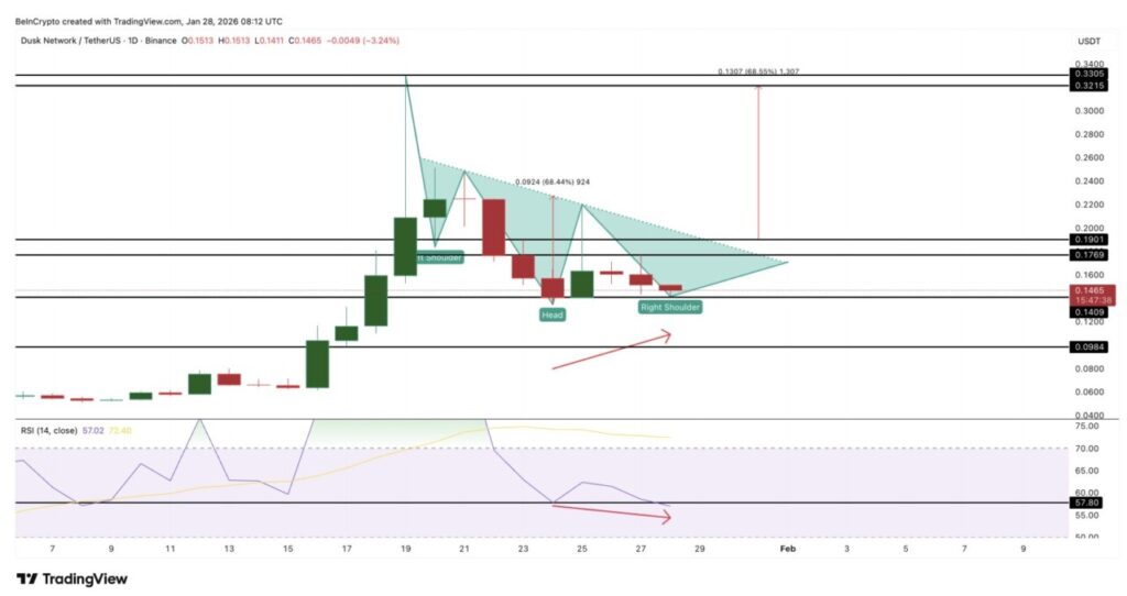 However, this pattern is only valid if the price remains above $0.140. If the price drops below that level, the divergence signal will fall and DUSK could be in danger of dropping to around $0.098.