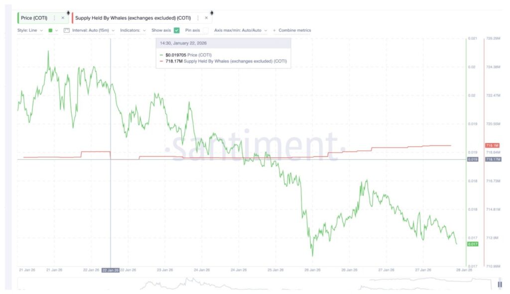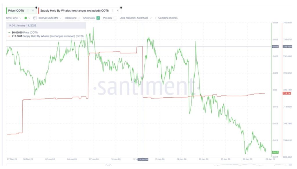 On-chain data shows a clear shift. Since January 13, COTI whales reduced holdings significantly, from 733.46 million COTI to a low of 718.17 million.