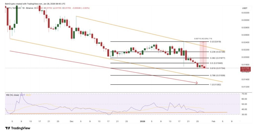 COTI’s price chart explains the reason behind the cautious yet interested attitude of the whales. Although it is still in a downward channel, the momentum indicator is starting to show a change.