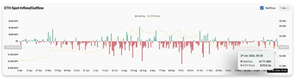 Data from Coinglass shows a net outflow of $177.38 million on January 29, making it one of the largest distribution days since early January. This movement indicates that ETH holders are sending their assets to exchanges for sale, rather than adding to their holdings at current price levels.