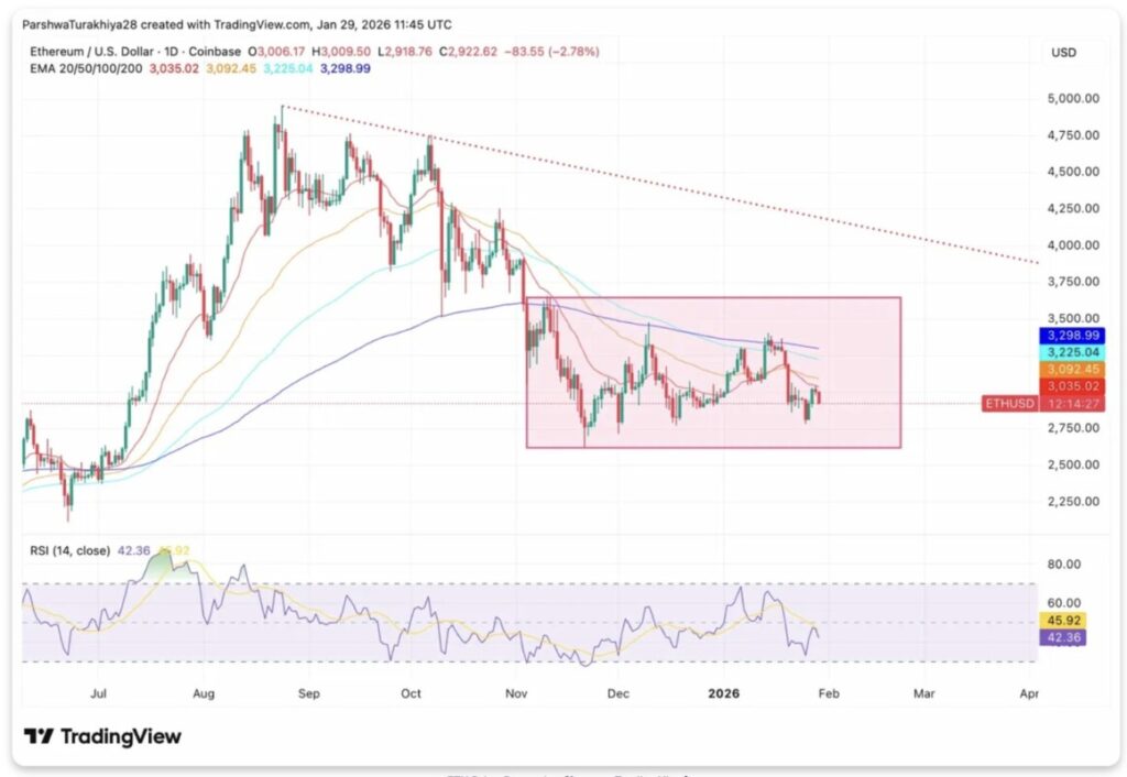 On the daily chart, Ethereum is trading below all four major Exponential Moving Averages (EMAs). The 20-day EMA is at $3,035, the 50-day EMA is at $3,092, the 100-day EMA is at $3,225, and the 200-day EMA is at $3,298. This stack of resistance levels creates a “price ceiling” that sellers have been successfully defending since mid-January.