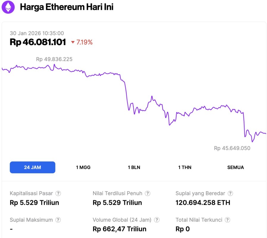 As of January 30, 2026, Ethereum was trading at approximately $2,733, equivalent to IDR 46,081,101—marking a 7.19% drop over the past 24 hours. Within that same period, ETH dipped to a low of IDR 45,649,050 and climbed to a high of IDR 49,836,225.