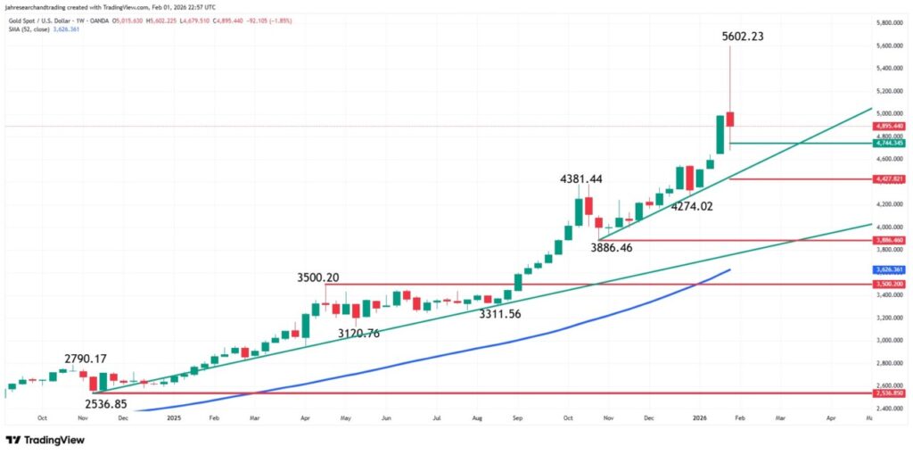 Jakarta, Pintu News – In today’s trading, XAUUSD (gold versus US dollar) showed a correction phase after hitting record highs above USD 5 600 per ounce last week. This correction is part of the broader market dynamics, influenced by profit-taking after a strong rally as well as a reaction to the strengthening US dollar and macro sentiment. Nevertheless, the direction of the medium-term trend remains the main focus of analysts to determine the potential for further movement in this market.