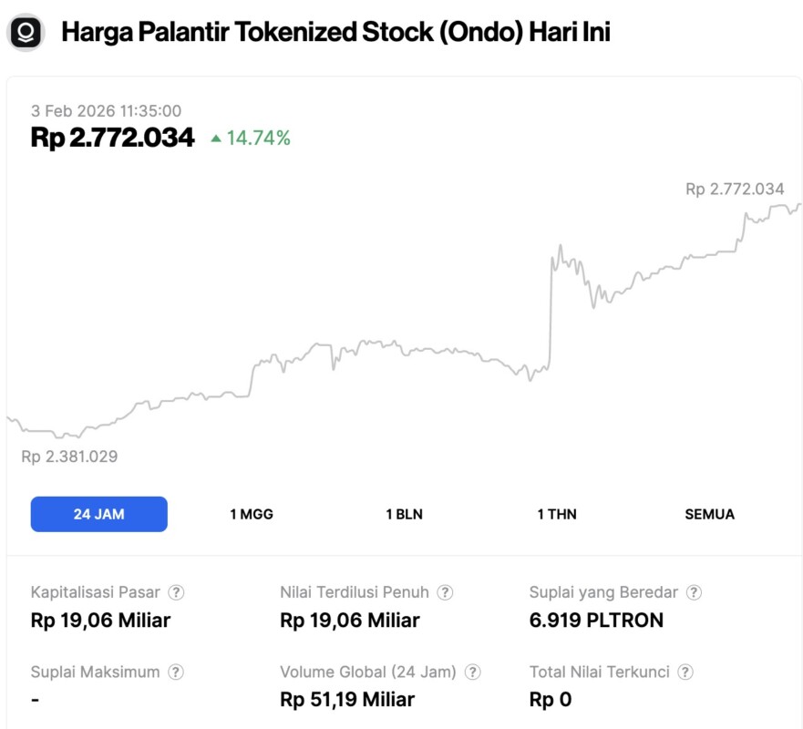 On February 3, 2026, the tokenized price of Palantir shares on the Pintu Market reached IDR 2,772,034, marking a sharp 14.74% increase from the previous day. The surge reflects strong investor enthusiasm following Palantir’s impressive fourth-quarter earnings report, which exceeded expectations.