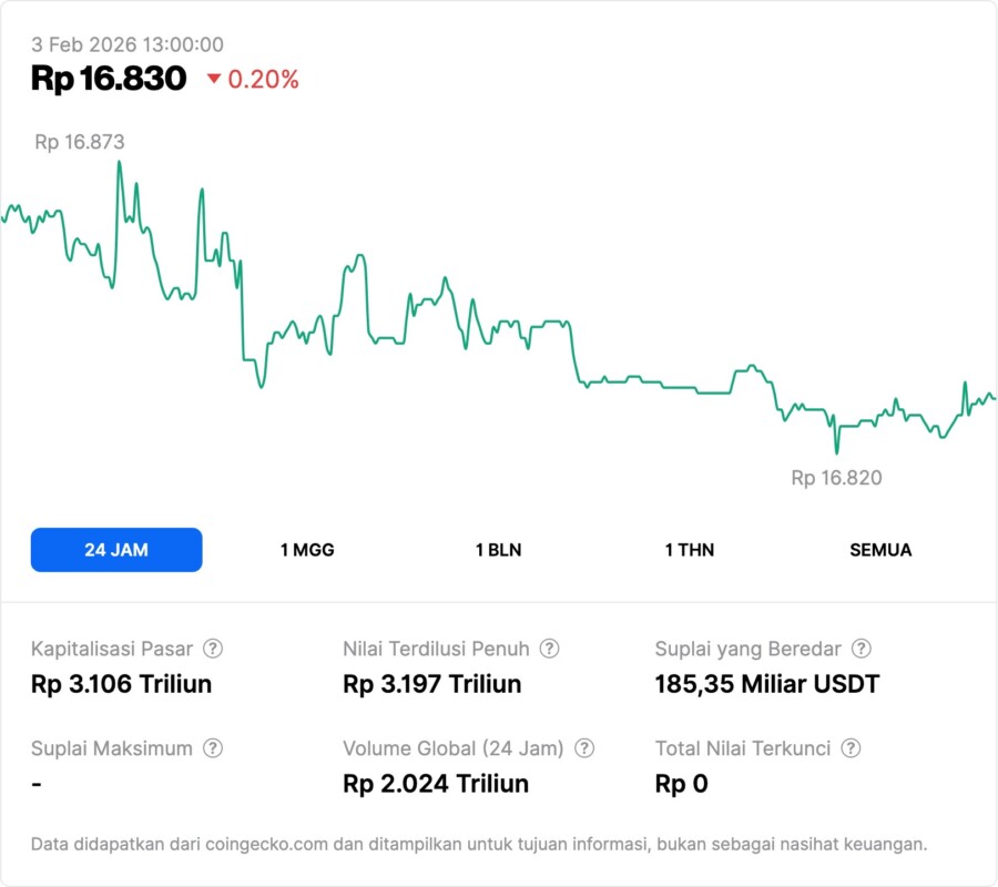 If converted to Rupiah with the assumption that the exchange rate of 1 USD = IDR16,788, the value of USDT is around IDR16,695 – IDR16,793 per USDT in several Indonesian trading markets.