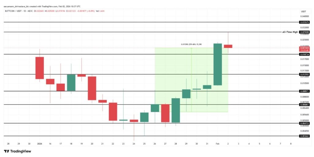 The meme coin surged by 259% in the last seven days, setting a new record high of $0.0292. As the price is still in the price discovery phase, BUTTCOIN faces minimal technical barriers. This structure favors further upside potential, as momentum traders typically push prices higher during the initial phase of expansion.
