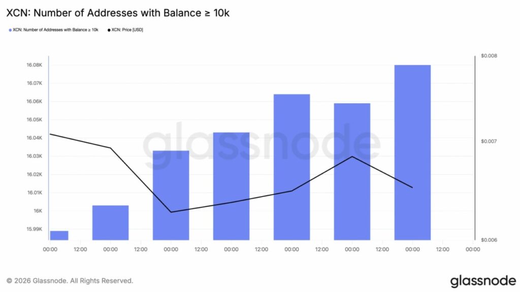 On-chain data shows a clear change in the behavior of large holders of XCN. The number of wallet addresses holding at least 10,000 XCN has steadily increased throughout the observed period.