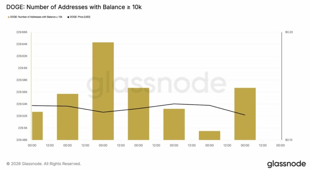 Data from Glassnode shows that large holders of Dogecoin still remain in the market. These whales may not be as prominent, but they are quietly maintaining their position. The chart monitors the number of DOGE addresses that hold at least 10,000 coins. Although there are minor fluctuations, there is no sharp decline in whale participation.