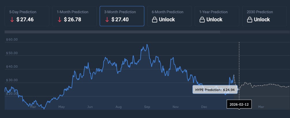 Some analysts, including those from CoinCodex, predict that HYPE’s rally may not continue on a consistent basis. Price projections predict a possible drop back to around US$24.94 in the next few days, which would mean a potential correction of more than 30 percent from current levels.