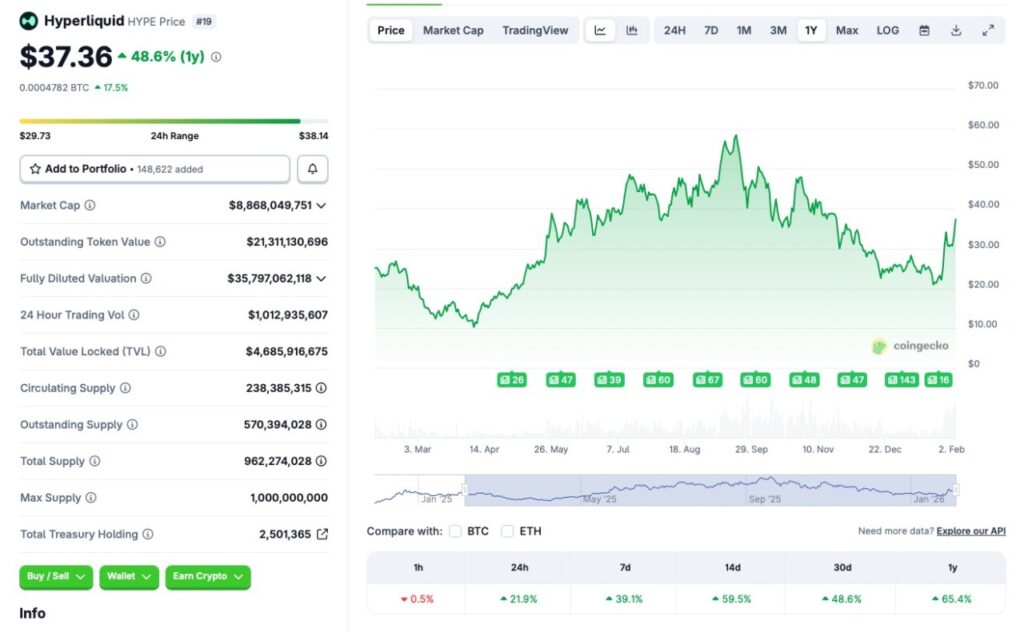 While the latest rally is exciting, the Hyperliquid price is still around 37 percent below its highest peak of around US$59.30 in September 2025. This suggests that the current price is still part of a recovery phase, not new highs.