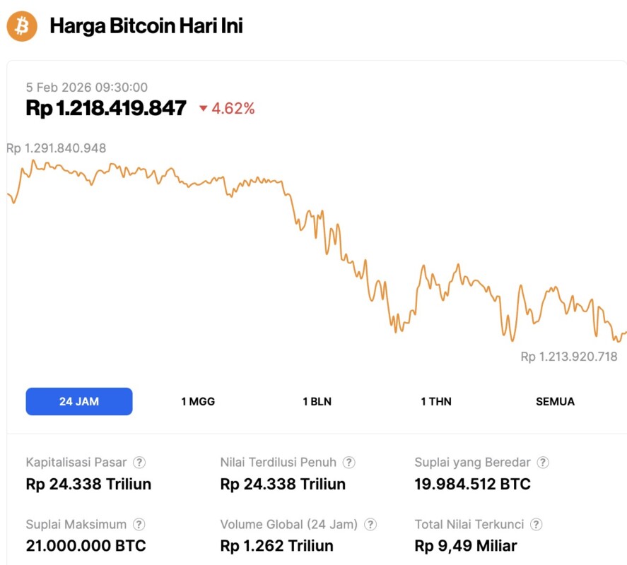 On February 5, 2026, Bitcoin was priced at $72,201, equivalent to approximately IDR 1,218,419,847, marking a 4.62% drop over the past 24 hours. During this period, BTC reached a low of IDR 1,213,920,718 and peaked at IDR 1,291,840,948.
