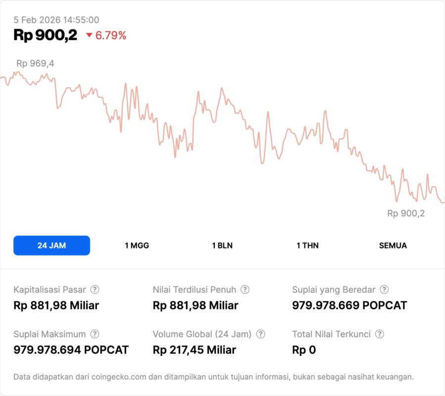 Popcat (POPCAT) price today was recorded at Rp911.1 per token on February 5, 2026 at 2:05 pm GMT. In the span of 24 hours, the price had moved in the area of Rp973 before dropping near the daily low of around Rp900. This fluctuation reflects the typical character of meme coins that are sensitive to market sentiment.
