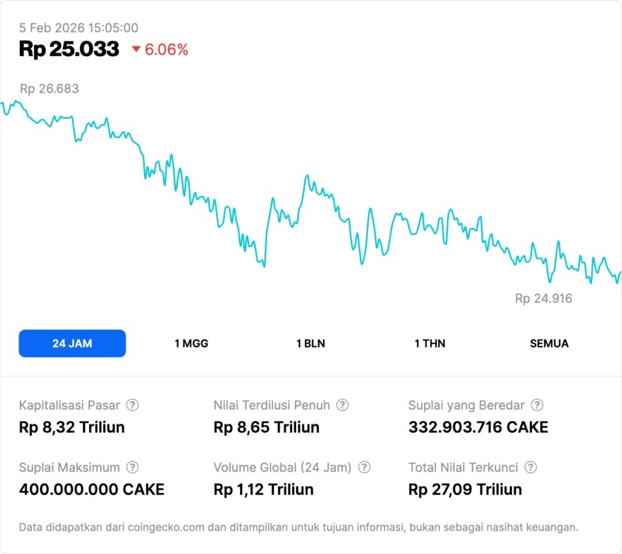 PancakeSwap’s market capitalization currently stands at around IDR 8.35 trillion. This figure places CAKE as one of the largest DeFi tokens in the BNB Chain ecosystem. Despite the corrected price, the market capitalization position shows that investor interest in PancakeSwap is still maintained.