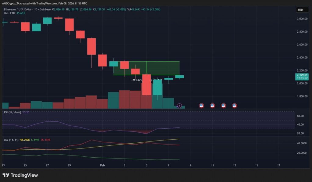 ETH’s Relative Strength Index (RSI) rose to the 30s range, signaling a weakening of short-term selling pressure. Trading volume also declined after the previous surge.