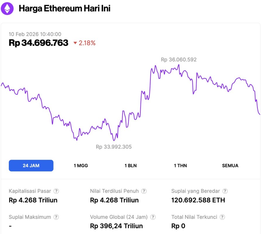 On February 10, 2026, Ethereum was trading at around $2,060, or roughly IDR 34,696,763, marking a 2.18% decline over the past 24 hours. During that period, ETH slipped to a low of IDR 33,992,305 and climbed to a high of IDR 36,060,592.