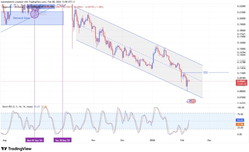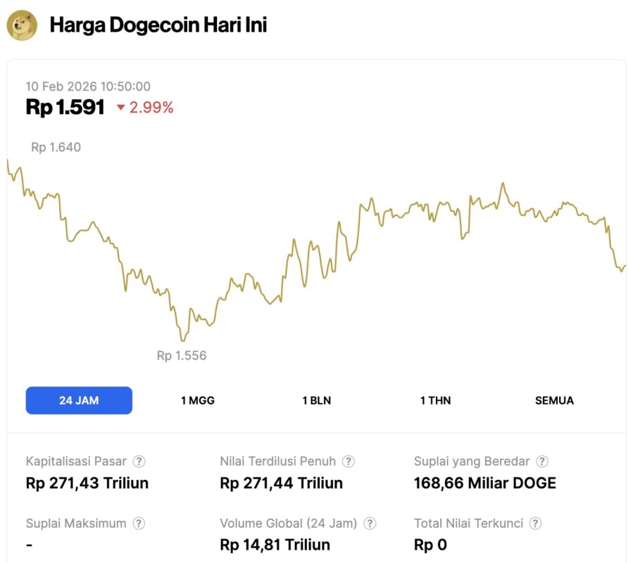 On February 10, 2026, Dogecoin’s price fell 2.99% over 24 hours to $0.09463, roughly equivalent to IDR 1,591. During the same period, DOGE traded within a range of about IDR 1,640 to IDR 1,556.