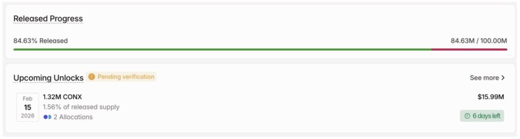On February 15, Connex will unlock 1.32 million CONX tokens to the market, with a value of approximately $15.99 million. This amount is equivalent to 1.56% of the supply already in circulation. Of the total, approximately 822,500 CONX will be allocated to the ecosystem. Meanwhile, 500,000 tokens will go to the community treasury.