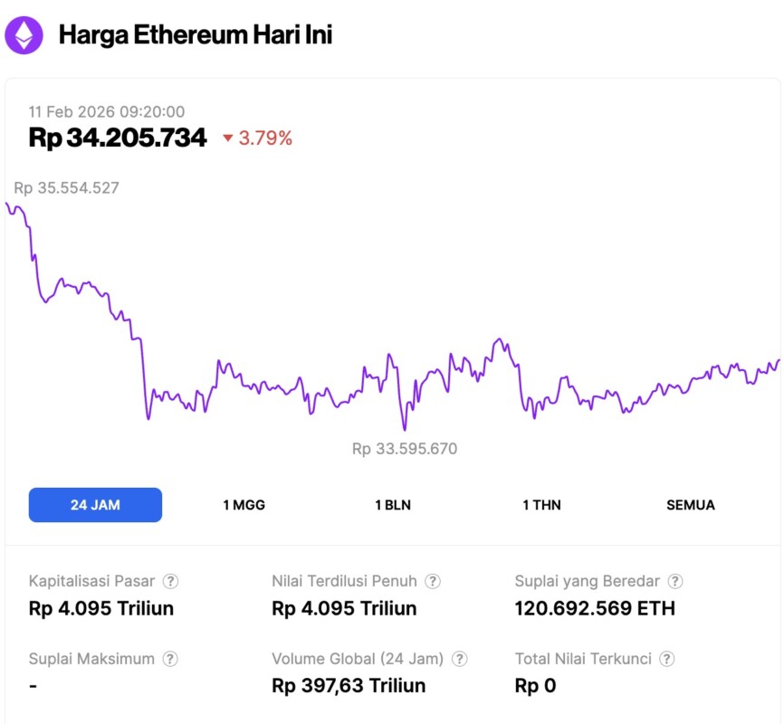 On February 11, 2026, Ethereum was trading at around $2,027, or roughly IDR 34,205,734, marking a 3.79% decline over the past 24 hours. Within that same period, ETH slipped to an intraday low of IDR 33,595,670 and climbed as high as IDR 35,554,527.