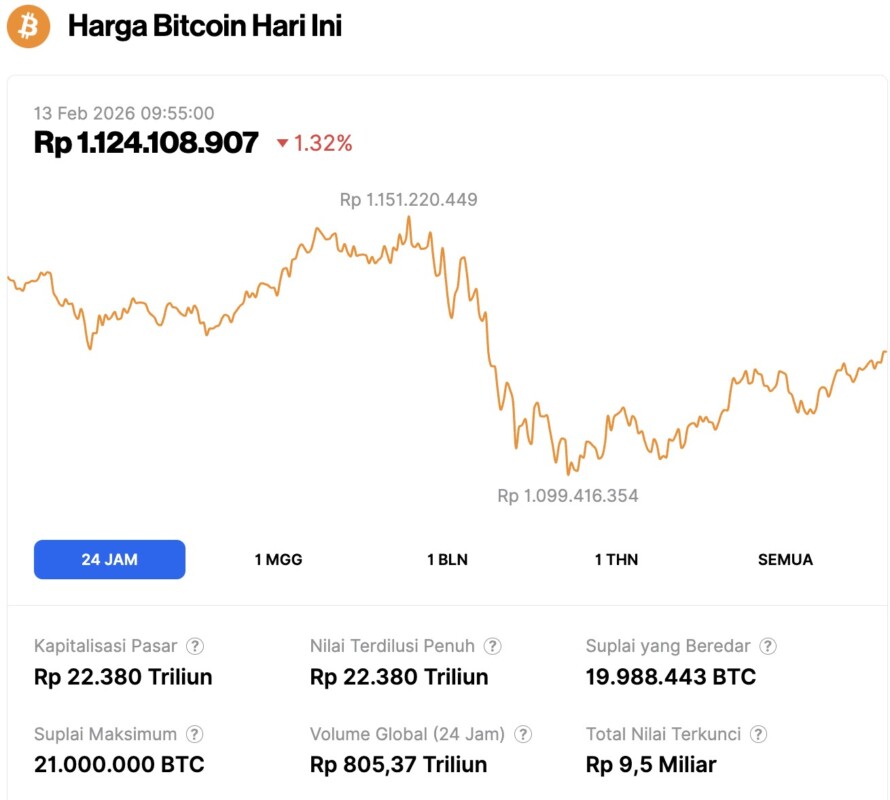 On February 13, 2026, Bitcoin was trading at around $67,565, or roughly IDR 1,124,108,907, marking a 1.32% decline over the previous 24 hours. During that period, BTC fell to a low of about IDR 1,099,416,354 and climbed as high as IDR 1,151,220,449.