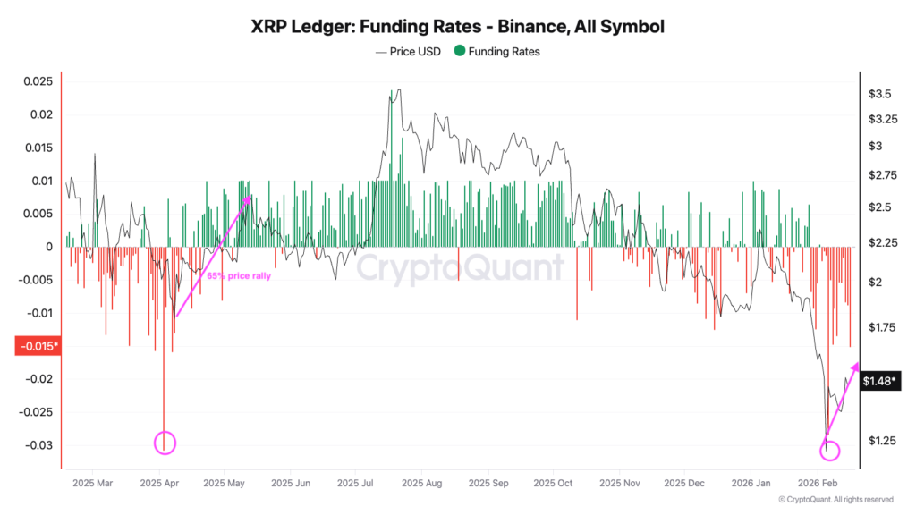 One other important signal came from Ripple’s (XRP) funding rate on Binance which briefly dropped to -0.028% when the price touched $1.12 on February 6, the lowest level since April 2025. Extreme negative funding rates usually signal the dominance of short positions and the capitulation of leveraged traders who go long.