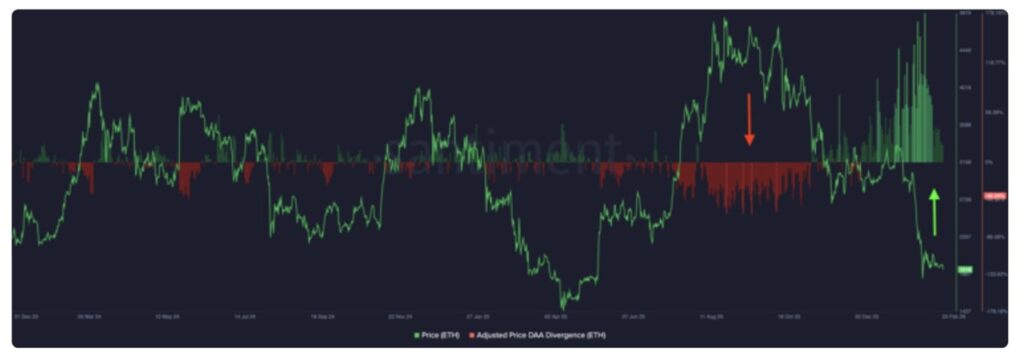 Interestingly, the number ofDaily Active Addresses has started to increase even though the Ethereum price remains under pressure. Increased network participation amid weak market conditions sometimes provides a hint that abottom is forming.