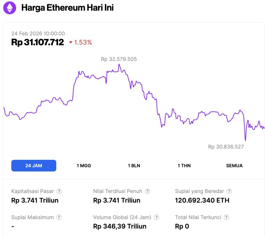 On February 24, 2026, Ethereum’s price softened to around $1,841—equivalent to roughly IDR 31,107,712—marking a 1.53% decline over the past 24 hours. Throughout the trading session, the asset navigated a volatile range, dipping to an intraday low of IDR 30,836,527 before encountering resistance at a high of IDR 32,579,505.