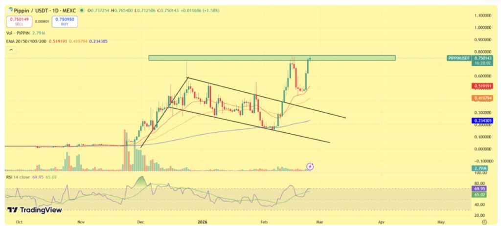 On February 24, Pippin moved in the $0.73-$0.75 range and was just below the all-time high area around $0.75. Its ability to hold near the highs, when the general market was correcting, confirmed the prominent relative strength. The breakout area around $0.68-$0.70 now serves as the nearest structural support.