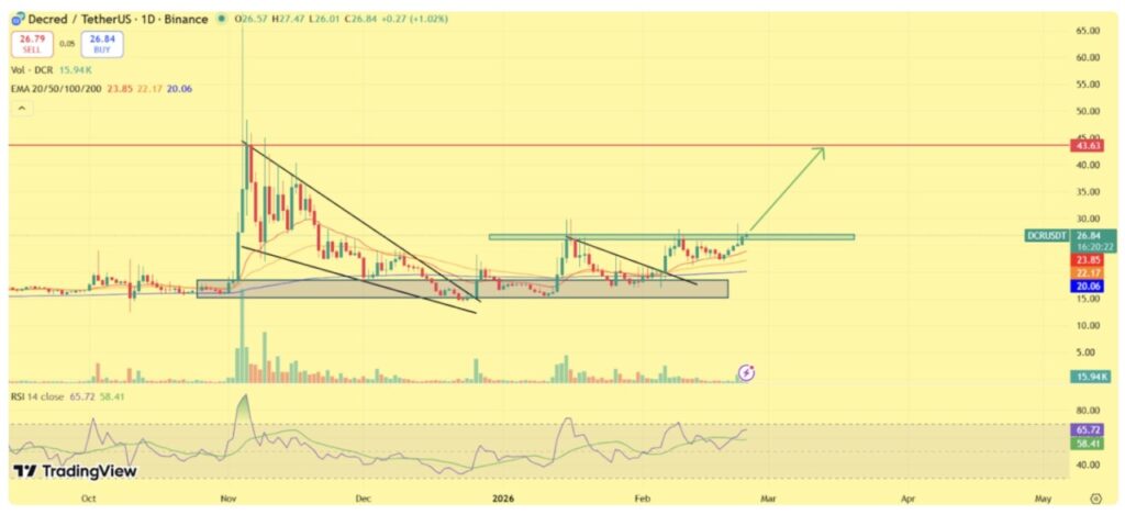 On February 24, DCR was around $26-$27, Decred was nearing the upper limit of its compression range. The $30 level is the most decisive breakout threshold. In the event of a confirmed breakout above this resistance area, upside potential could open up towards $35, which is the next major supply zone.