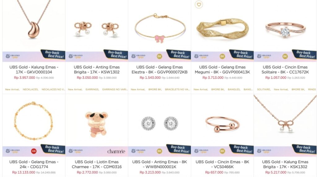 Based on the catalog on the UBS Life Style website, the price range of UBS jewelry today varies mainly influenced by gold grade (8K, 17K, to 24K) and product type (rings, bracelets, earrings, necklaces).