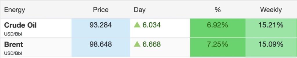 Meanwhile, Brent also spiked higher, trading at 98.648 USD per barrel, with a daily gain of 6.668 USD, which equates to 7.25%. For the week, Brent recorded a gain of 15.09%.