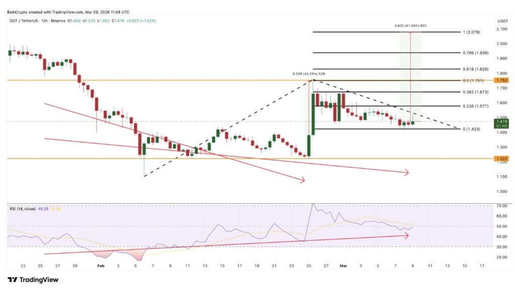 Technically, the chart shows a possible bullish divergence on the Relative Strength Index (RSI). RSI is a momentum indicator that measures the strength of price movements. In the period from January 25 to March 8, the DOT price formed a lower low, while the RSI formed a higher low. This pattern indicates that selling pressure has the potential to weaken. A similar divergence also appeared from January 25 to February 24, shortly before the 43% rally occurred.