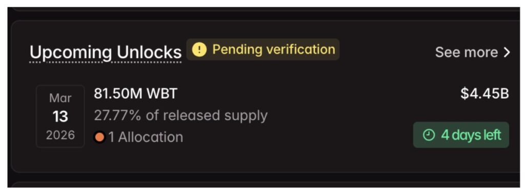 The main catalyst occurred on March 13, when 81.5 million WBT tokens were scheduled to be unlocked through the cliff unlock mechanism, which is the release of a large number of locked tokens all at once, rather than gradually over time.
