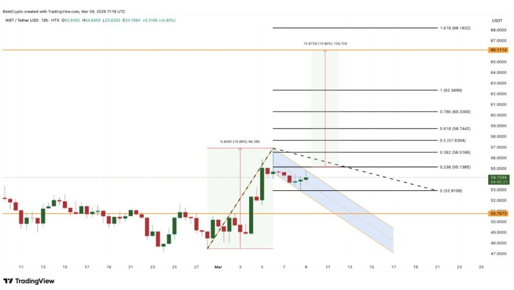 Despite the risk of additional supply, the technical structure on the 12-hour chart is still bullish. In the past seven days, WBT gained around 11% and is still rallying around 90% on an annualized basis, which confirms the broader uptrend.