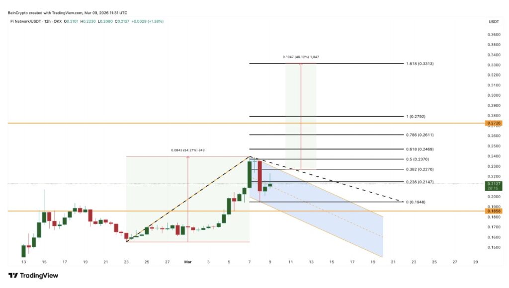 From a technical perspective, PI has recently recorded a strong rally. In the span of February 23 to March 7, it rose by about 54% and peaked at around $0.239 before entering a consolidation phase. The current structure resembles a bull flag pattern, which is a trend continuation pattern that usually forms when the price pauses inside a descending channel after a sharp rally.