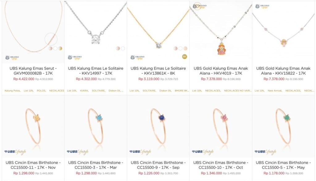 The UBS gold products featured above are dominated by 17K gold, although there is also an 8K variant in one of the solitaire necklaces. This shows that UBS offers quite a variety of jewelry options.