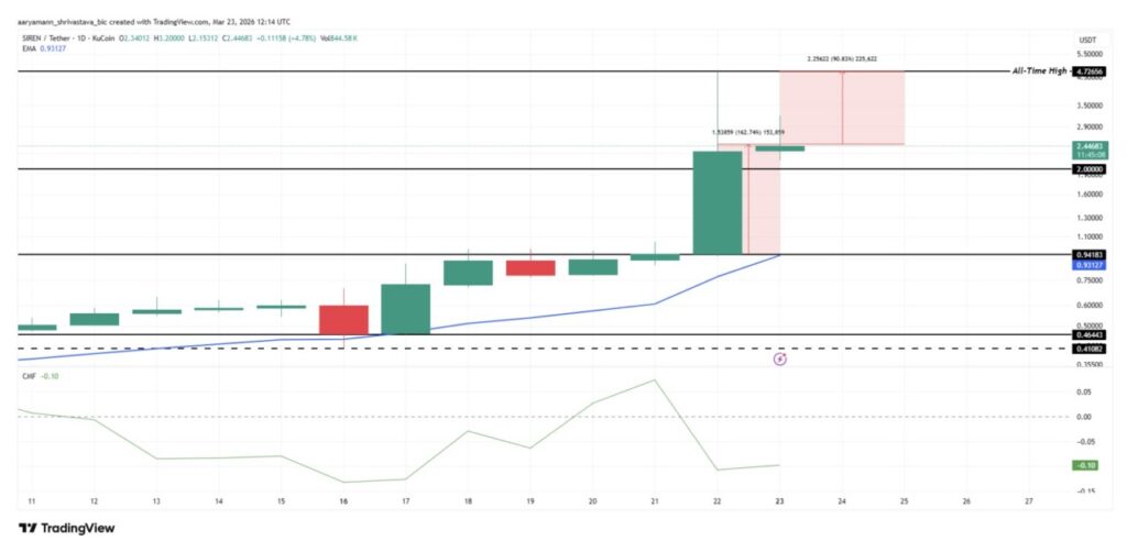 On March 23, Siren (SIREN) was briefly trading at $2.44 after surging 163% in just two days from its bottom on March 21. Its record high of $4.72 is still about 90% above the current position, and the projected measured move on the chart also points to that area.