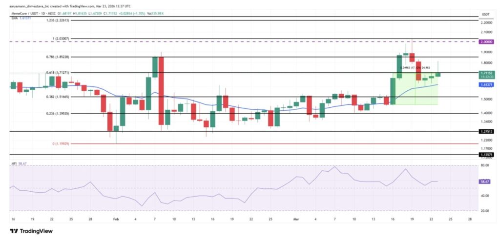 On March 23, 2026, MemeCore was trading at $1,711, still up 1.57% and consolidating just below the 0.786 Fibonacci level of $1,852. This area is the upper limit of the measured move zone formed after the breakout on March 18.