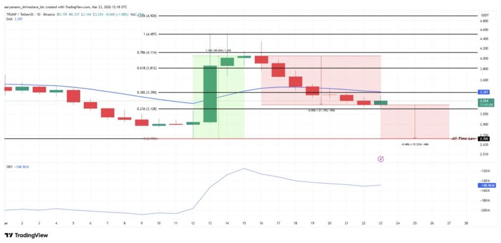 On March 23, 2026, Official Trump was trading at $3,254, up 1.88%. However, the On-Balance Volume (OBV) indicator had actually peaked around March 13-14, and then continued to decline from around -$120 million to -$148.96 million. The drop in OBV when prices recovered suggests that volume reflects distribution rather than accumulation.