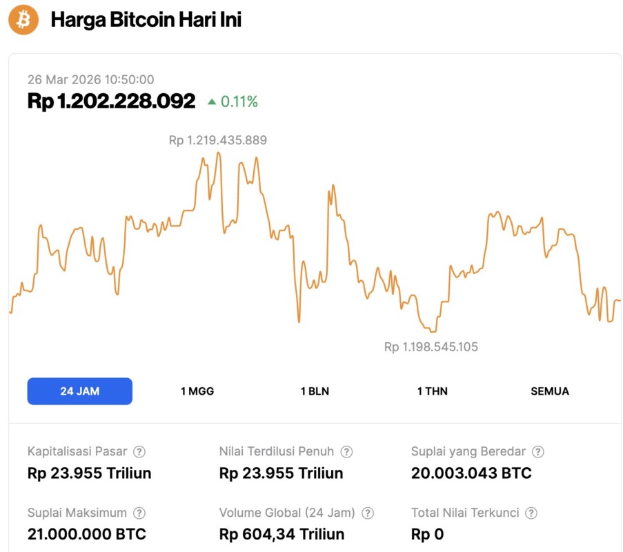 As of March 26, 2026, Bitcoin was trading at $70,793, or around IDR 1,202,228,092, marking a modest 0.11% gain over the past 24 hours. During that period, BTC fell to a low of IDR 1,198,545,105 before climbing to a daily high of IDR 1,219,435,889.