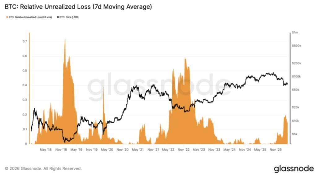 This chart tracks how large a portion of the market is at a loss over time. Currently, unrealized losses have started to increase again, which means that more and more market participants are holding Bitcoin below their purchase price.