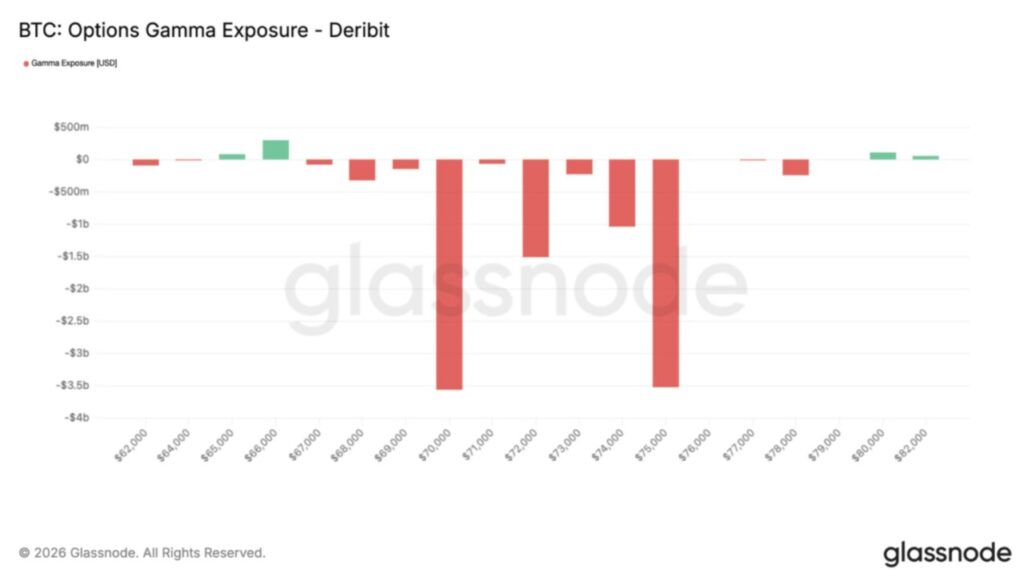 Options data shows a sizable negative gamma exposure in the range of $70K-$75K, indicating strong hedging pressure from dealers. This creates resistance as prices move up and increases volatility around important levels. When gamma is in the negative region, price movements usually become more sensitive and easily magnified.