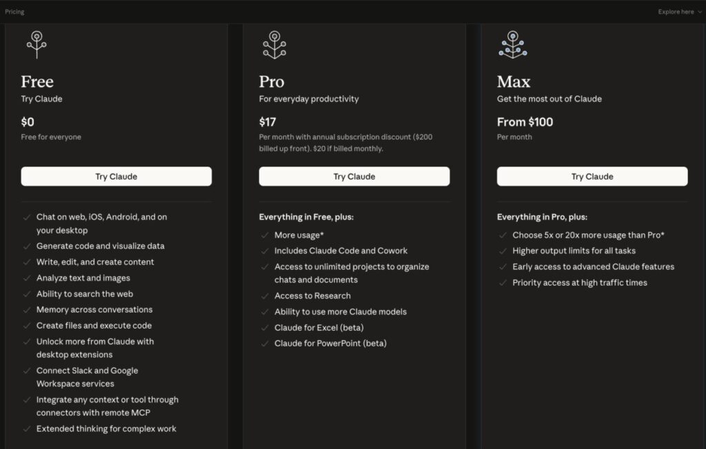 Users get greater usage capacity, access to Claude Code and collaboration features (Cowork), as well as the ability to manage projects without limits in organizing chats and documents. In addition, there is access to research features, the use of more Claude models, and additional integrations such as Claude for Excel and PowerPoint (in beta).