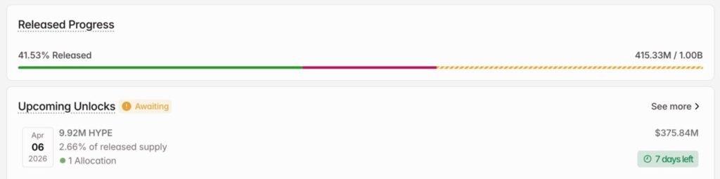 Hyperliquid became the project with the largest unlock in early April. On April 6, around 9.92 million HYPE tokens will be released with a value of $375.84 million. This is equivalent to 2.66% of the circulating supply.