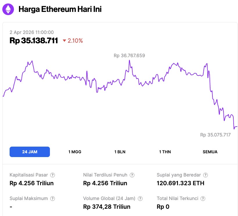 As of April 2, 2026, Ethereum was trading at around $2,054, or approximately IDR 35,138,711, down 2.10% over the past 24 hours. During that period, ETH fell to a low of IDR 35,075,717 and climbed as high as IDR 36,767,659.