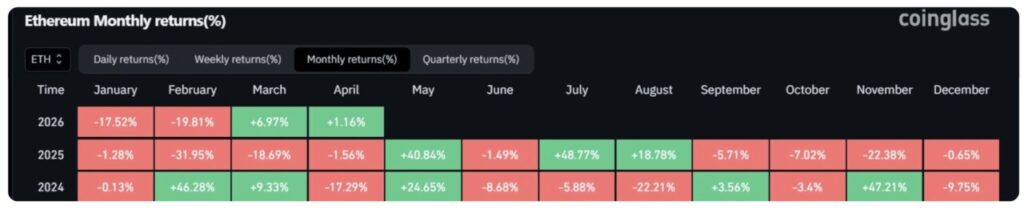 Throughout March, ETH posted an average gain of around 7%, although financial markets throughout the month came under pressure from the war between Israel, the US, and Iran. The largest altcoin had previously posted consecutive declines from September to February. In contrast, a number of major stock and commodity indices closed the month in the negative zone.